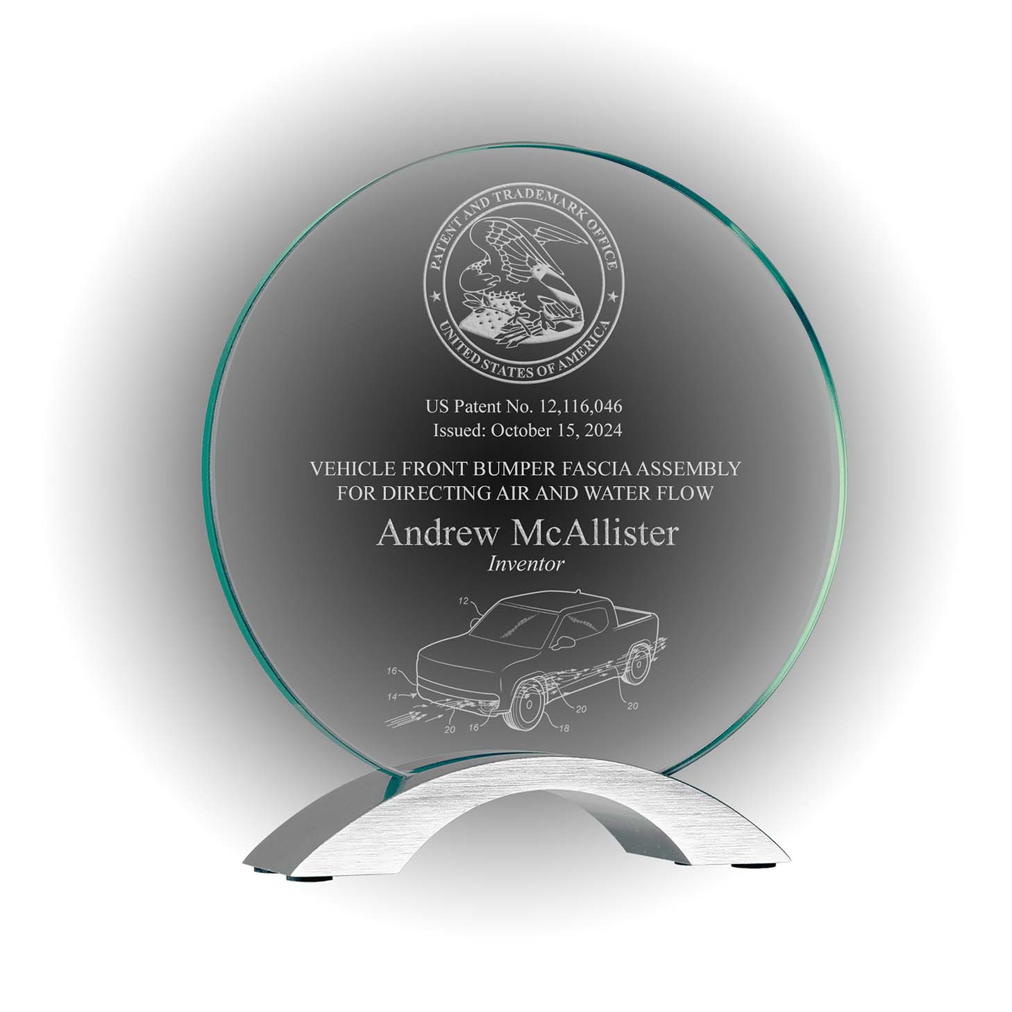 Custom engraved with inventor name, patent number, issue date, patent title, and optional patent drawing.