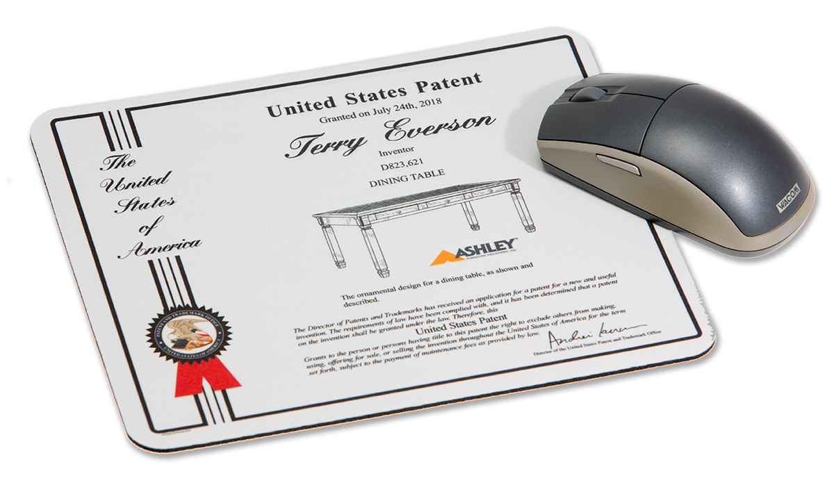 What a wonderful and usable way to celebrate and recognize the creativity and innovative spirit of employees and inventors in your organization. Measuring 7 3/4" x 9 1/4" x 1/8" and completely flexible, this customized mouse pad is perfect for the inventor's or employee's desk or to take on the go or use in a home office. A sure conversation starter to all who see it. We can print a patent cover page or work with you to design the content of your choice, colors and style in any quantity.
