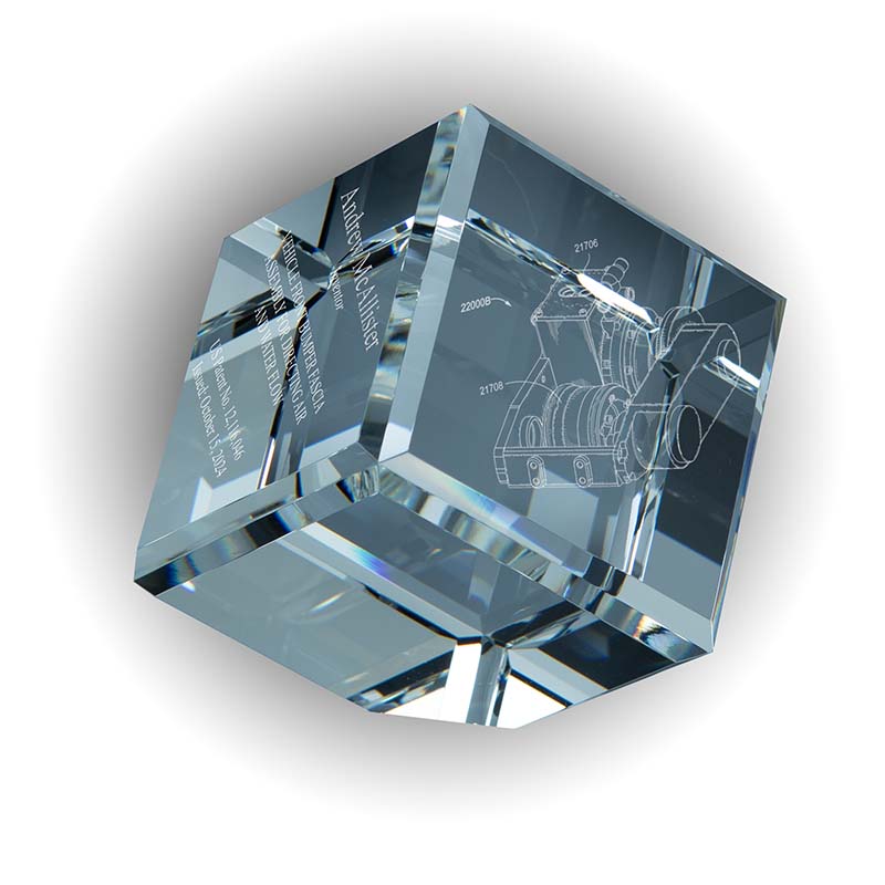 As light passes through the crystal, the engraving appears suspended within, revealing new depth and detail from every perspective. The result is a refined, museum-quality display that communicates innovation, precision, and lasting significance.