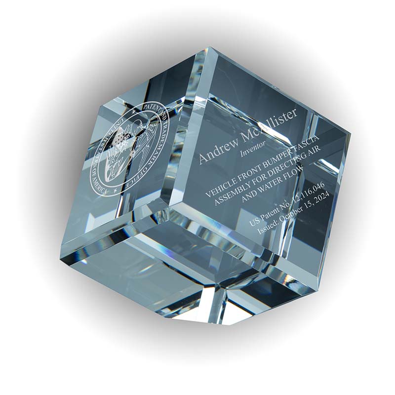 Crafted from premium optical crystal and available in three distinct sizes, the sculptural form is designed to be viewed from every angle. One face features the USPTO seal, another presents the inventor’s name and patent details, and the third showcases a detailed patent illustration, creating a balanced and immersive storytelling experience within the crystal itself.