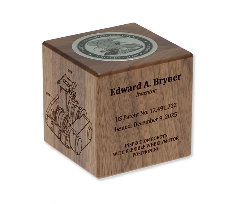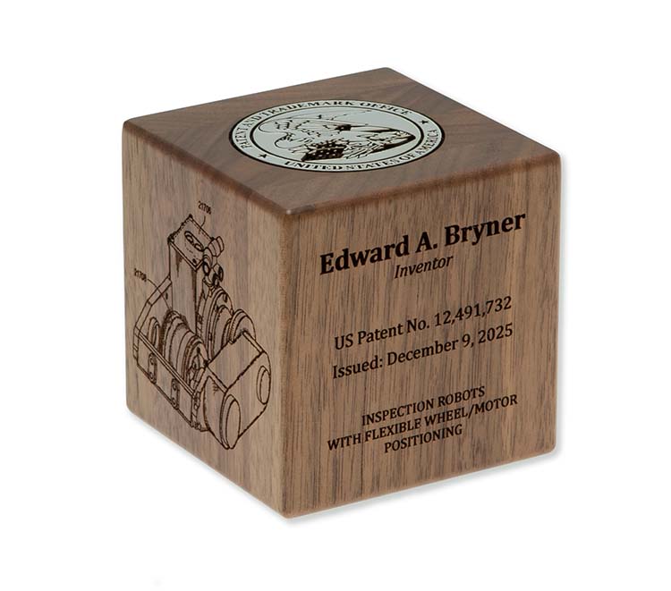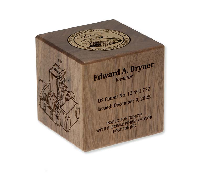 Each cube is engraved on two sides as standard, featuring the inventor’s name, patent number, issue date, patent title, and a detailed patent illustration. The USPTO seal is prominently displayed on the top face, creating a formal and authoritative focal point. Customers may choose to engrave up to two additional sides, allowing space for an additional patent drawing, company logo, or supplemental recognition text—making each cube uniquely personal.