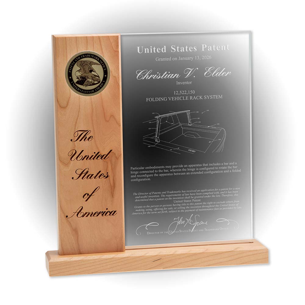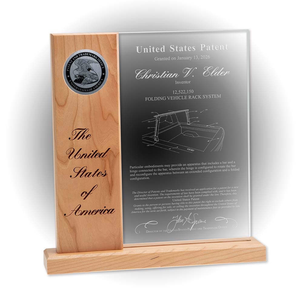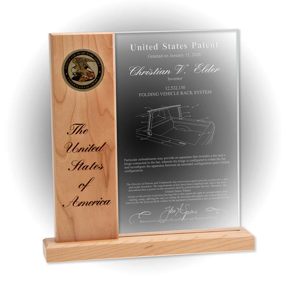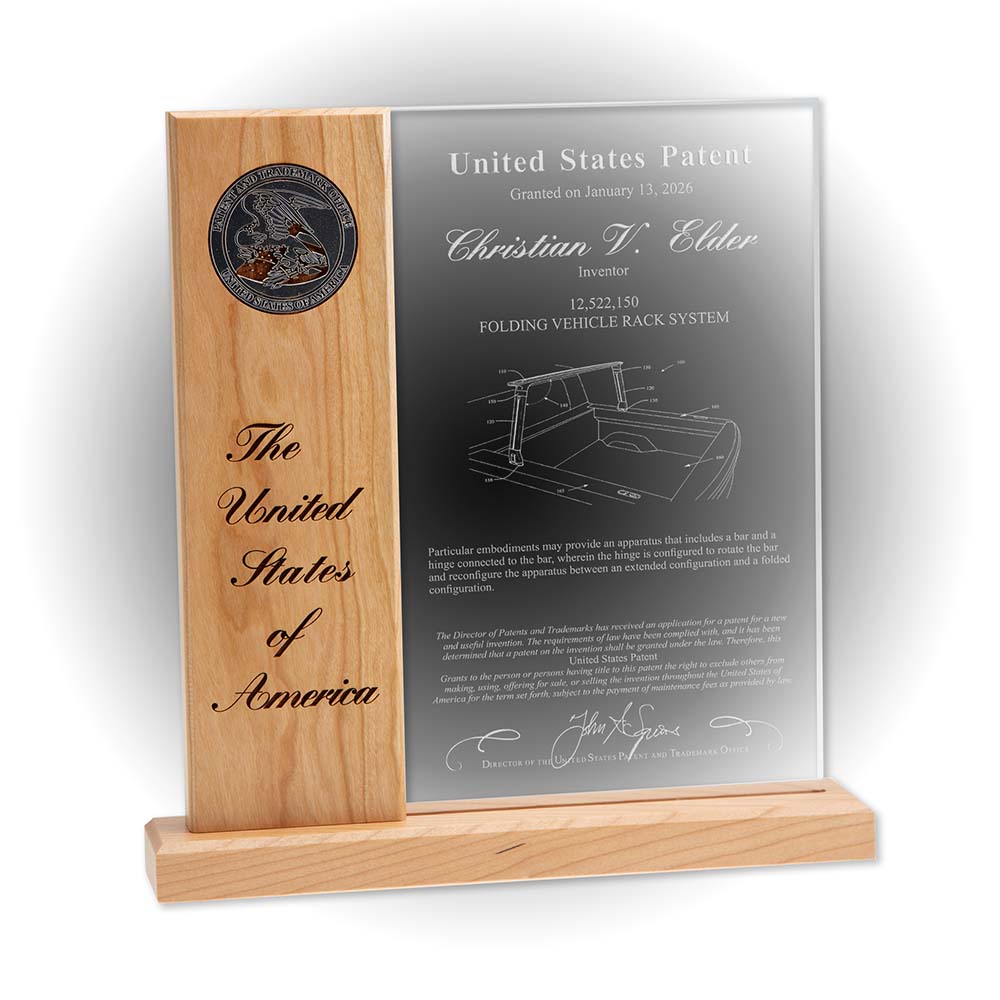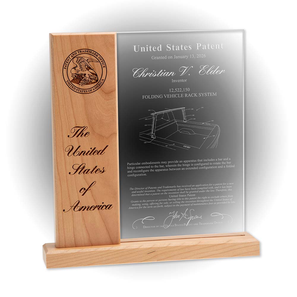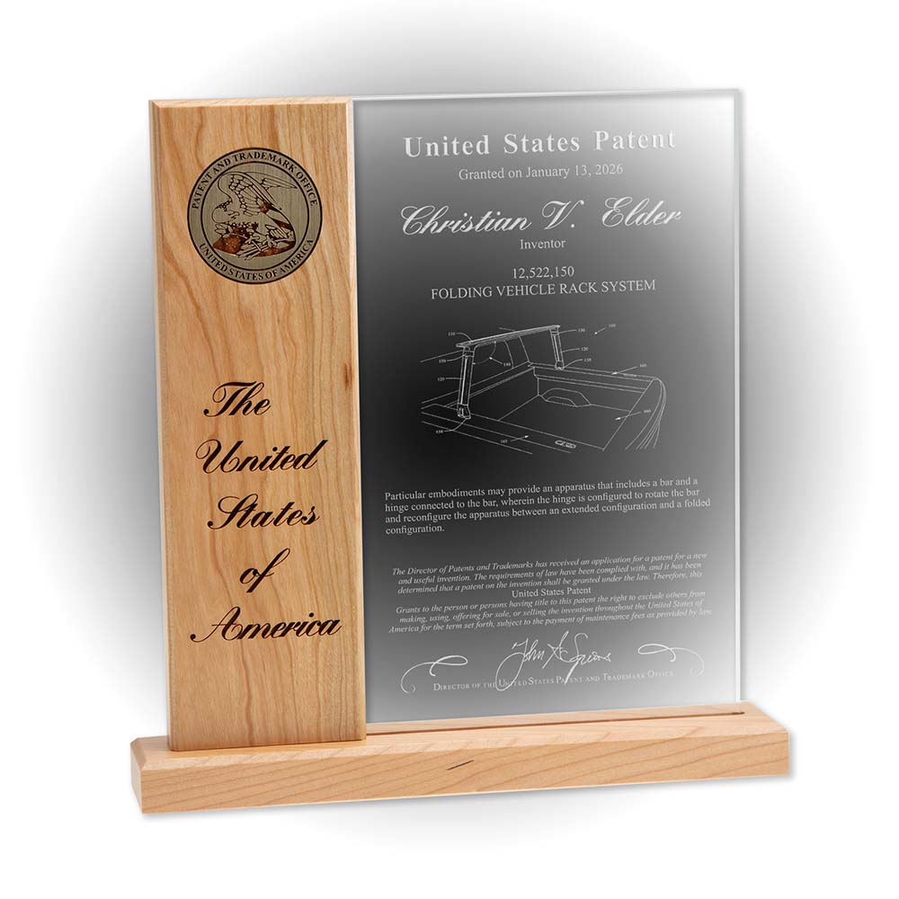 This solid cherry stand-up patent award offers a refined and authoritative way to commemorate the granting of a United States patent. Handcrafted from premium walnut and paired with a ¼″ thick clear acrylic panel, this award transforms official patent documentation into a museum-quality display.
