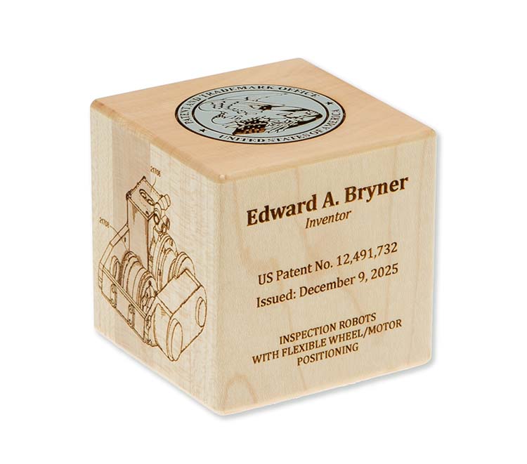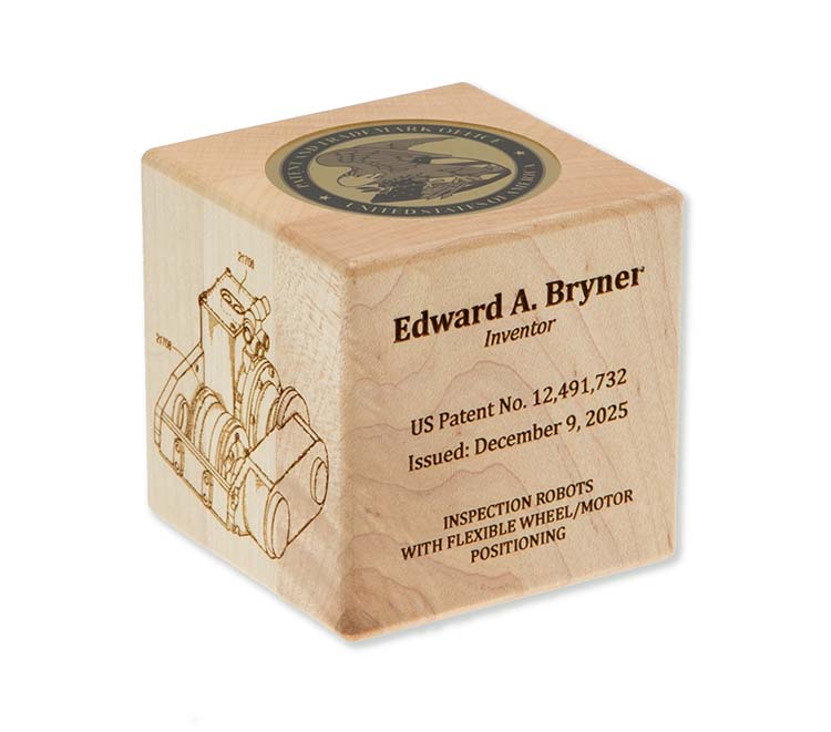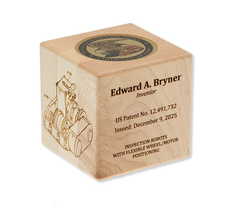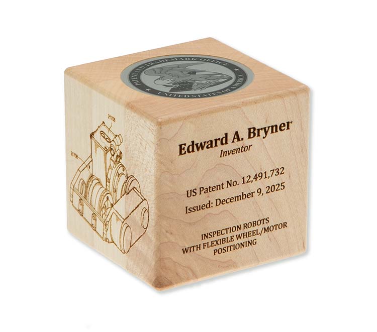 Each cube is engraved on two sides as standard, featuring the inventor’s name, patent number, issue date, patent title, and a detailed patent illustration. The USPTO seal is prominently displayed on the top face, creating a formal and authoritative focal point. Customers may choose to engrave up to two additional sides, allowing space for an additional patent drawing, company logo, or supplemental recognition text—making each cube uniquely personal.