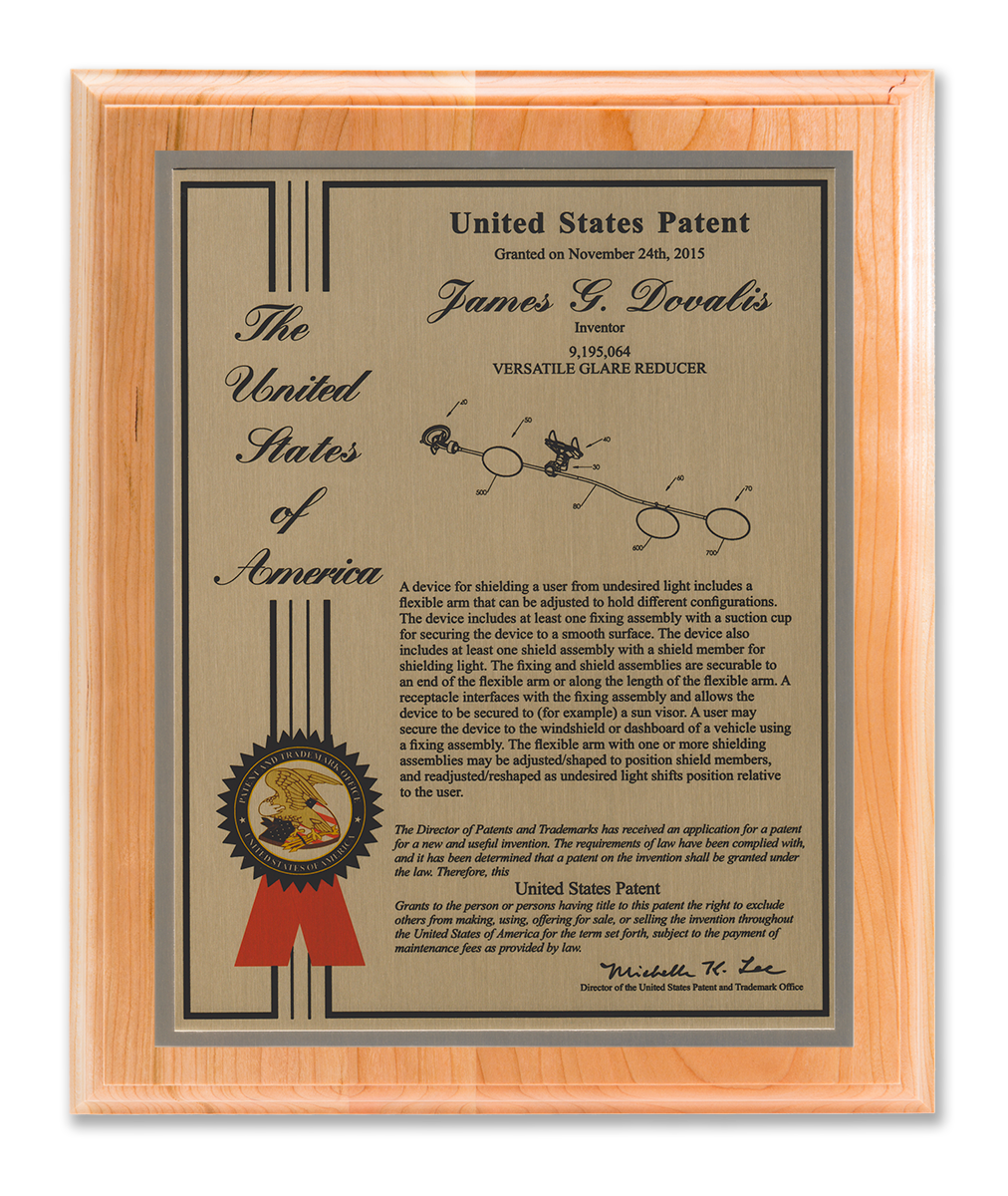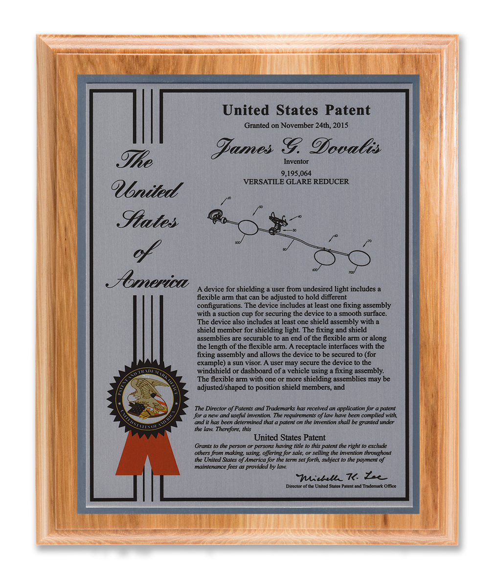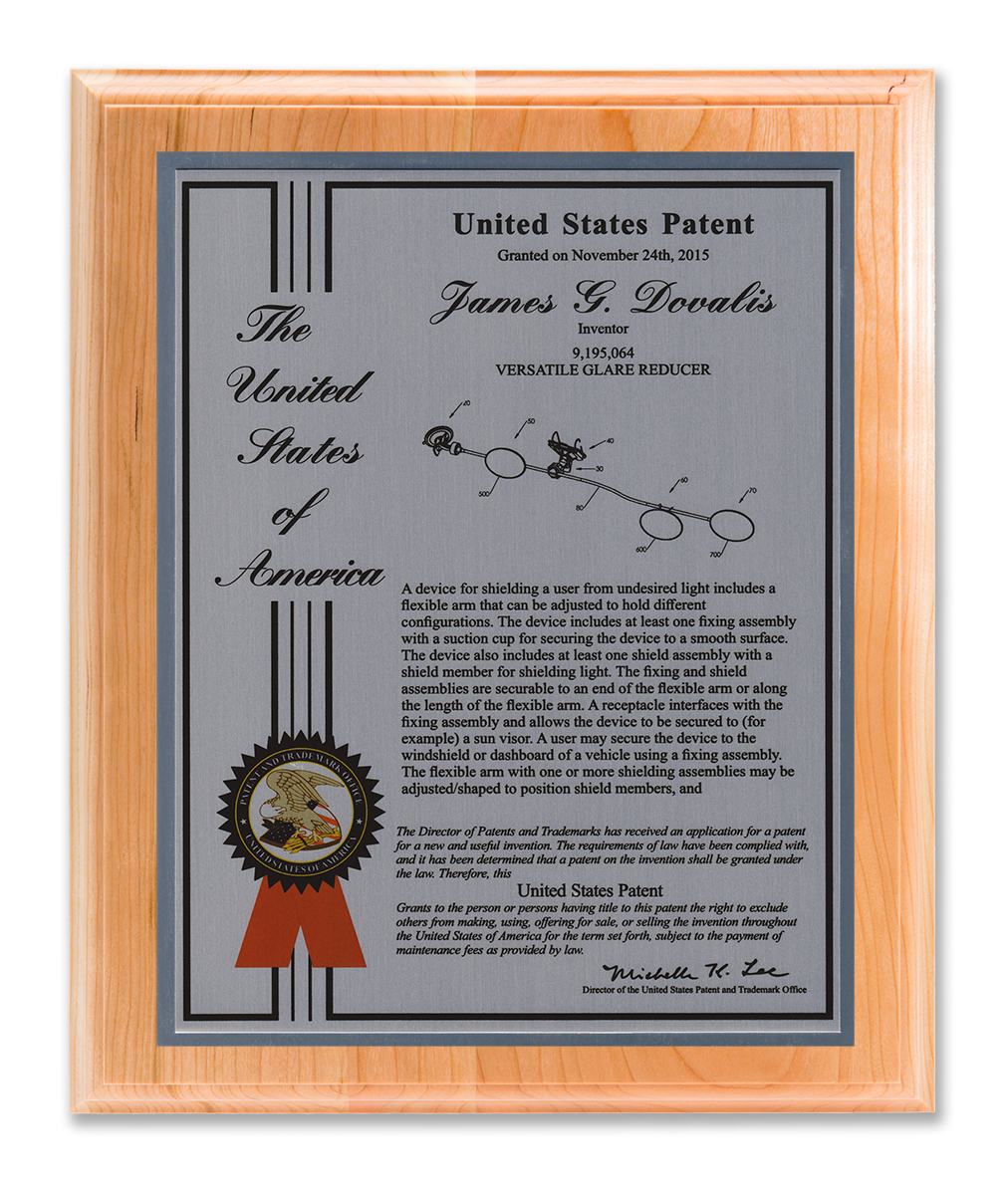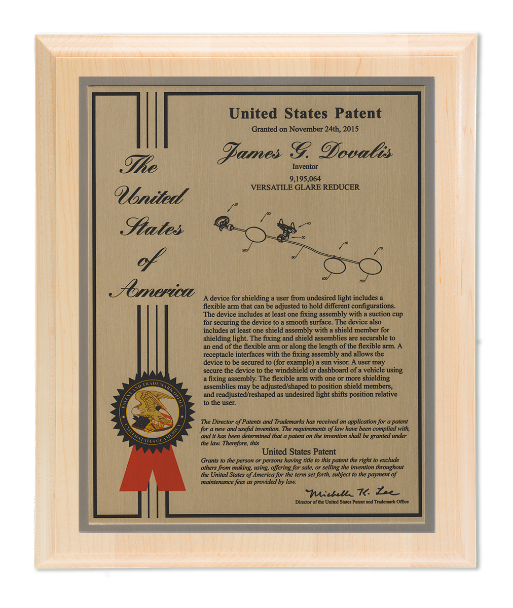 As one of our most patriotic layouts for patent recognition, the Liberty Series patent plaques are a stunning way to display your patent cover page. Your patent award information is attractively enhanced with a United States of America border and seal. The Liberty Series patent award is finished with a timeless and sleek edge style. You select from a variety of sizes as well as solid woods and plating selections to match your home, office, or corporate furnishings. Adding color is a perfect complement to the magnificence of the Liberty design patent plaque.