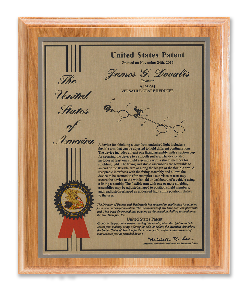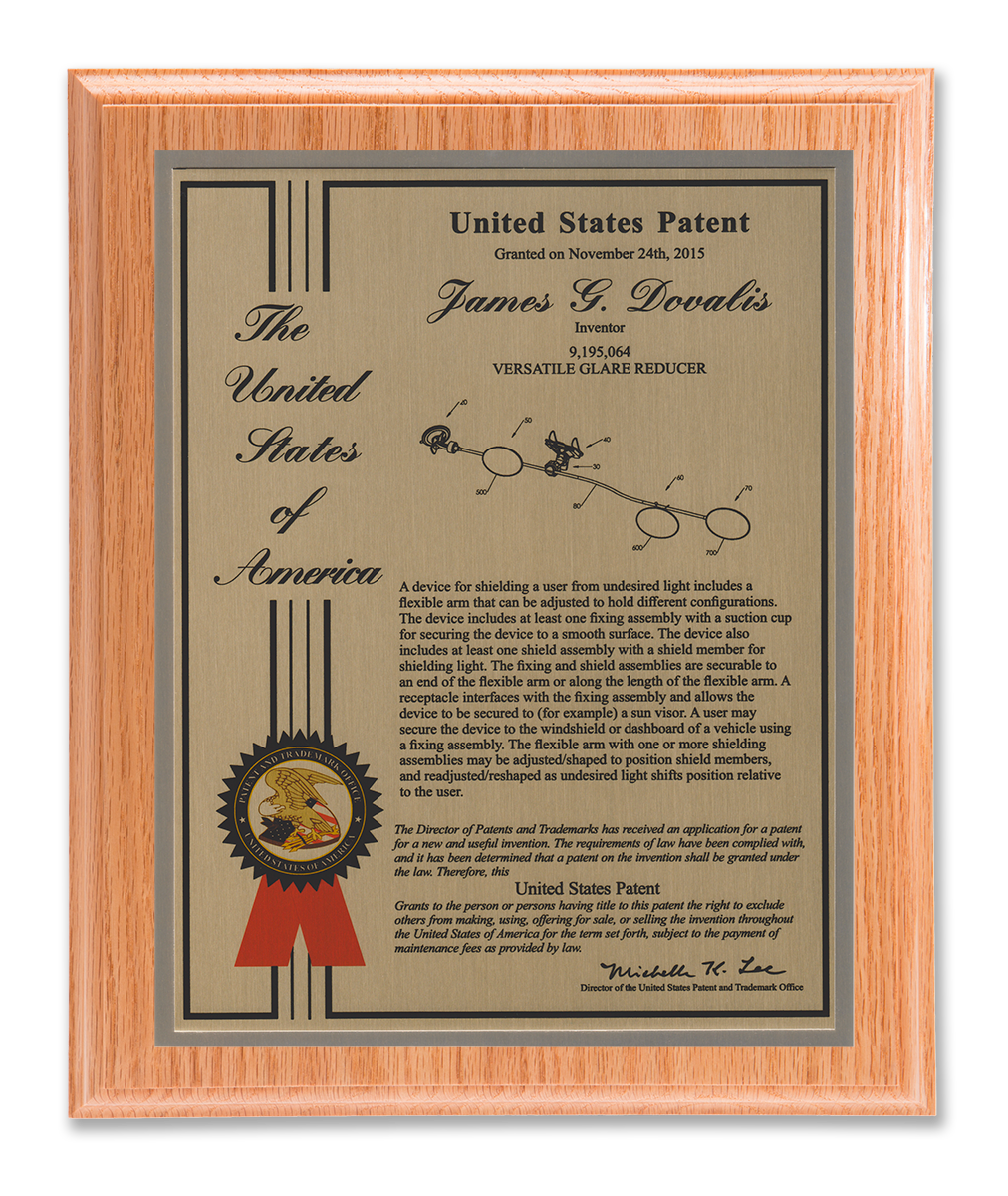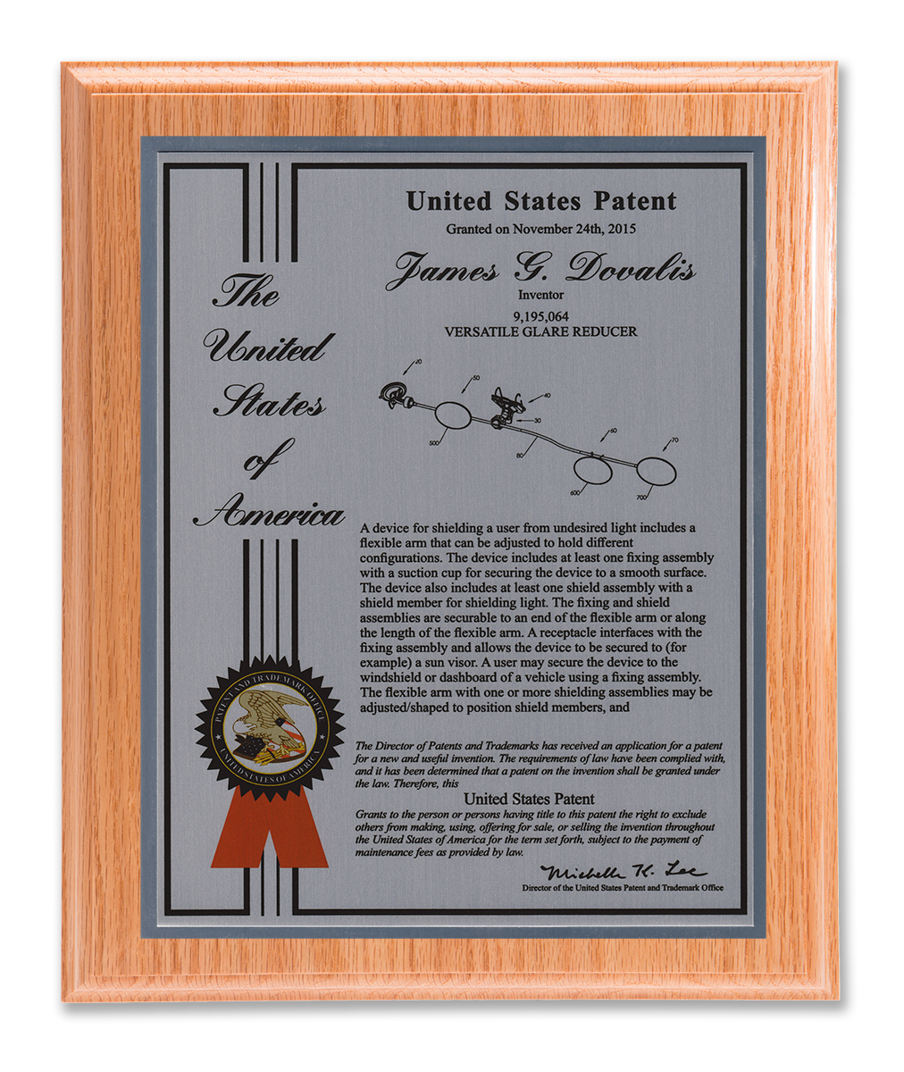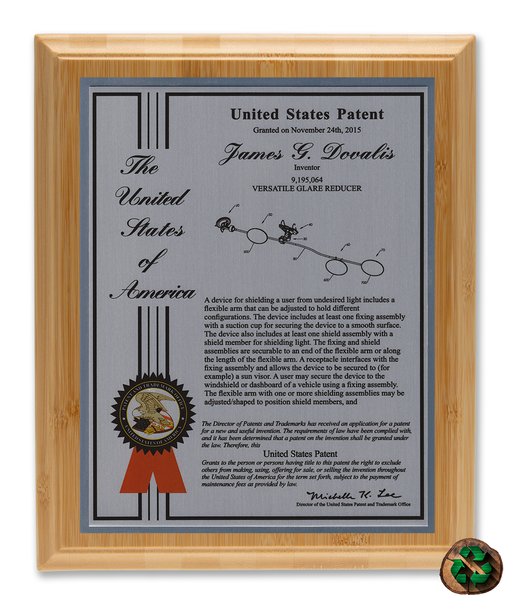 As one of our most patriotic layouts for patent recognition, the Liberty Series patent plaques are a stunning way to display your patent cover page. Your patent award information is attractively enhanced with a United States of America border and seal. The Liberty Series patent award is finished with a timeless and sleek edge style. You select from a variety of sizes as well as solid woods and plating selections to match your home, office, or corporate furnishings. Adding color is a perfect complement to the magnificence of the Liberty design patent plaque.