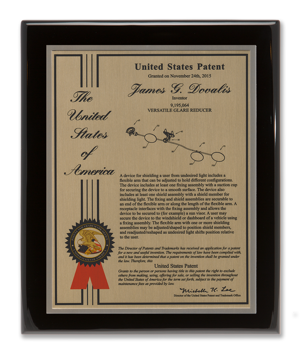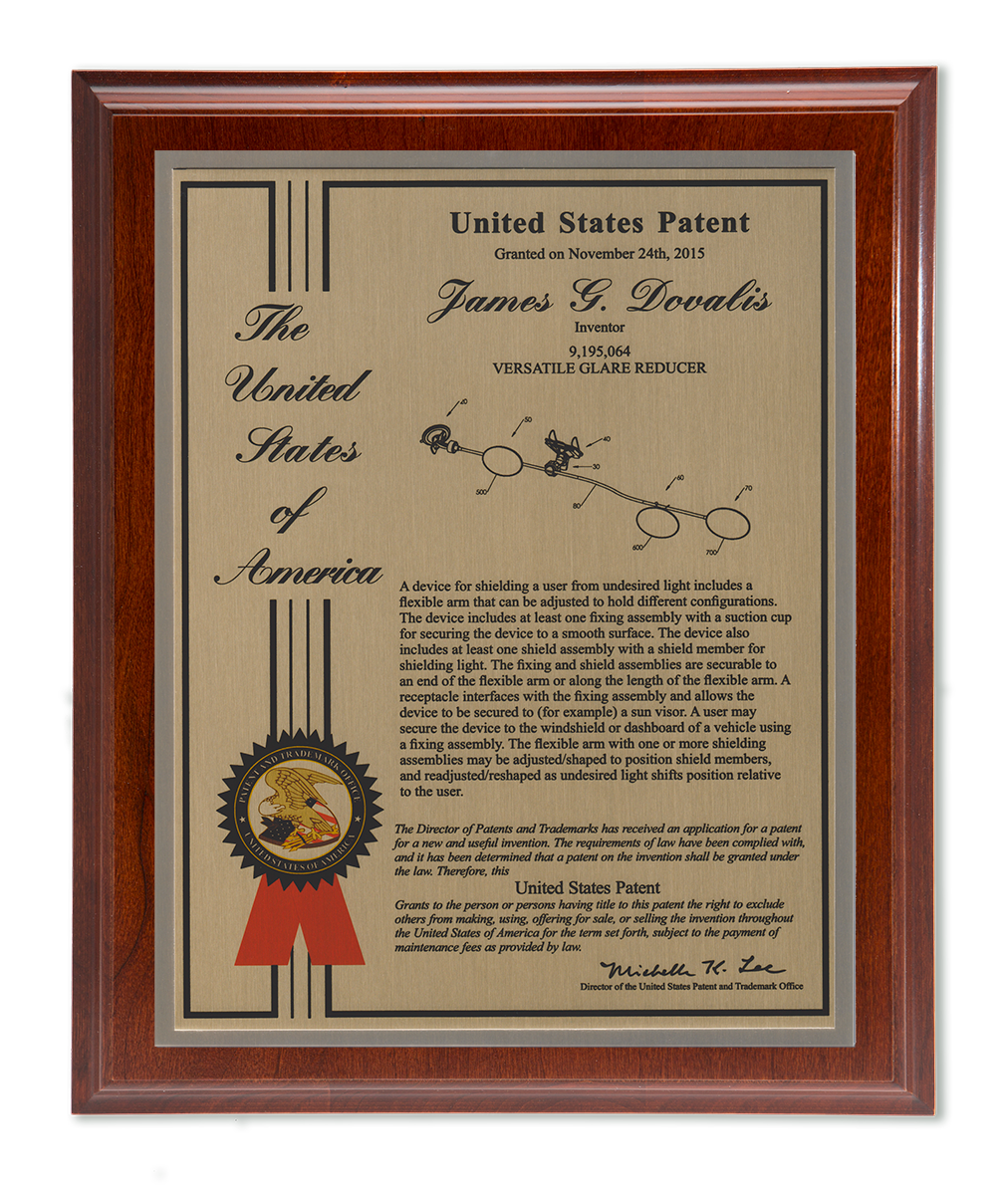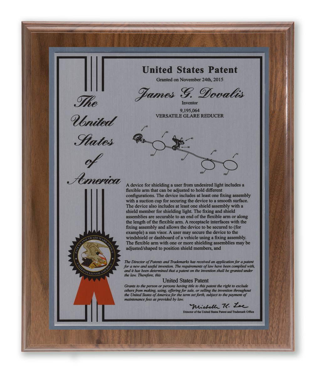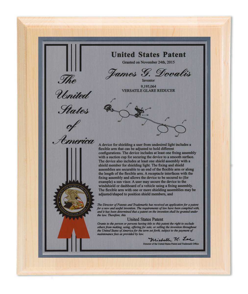 As one of our most patriotic layouts for patent recognition, the Liberty Series patent plaques are a stunning way to display your patent cover page. Your patent award information is attractively enhanced with a United States of America border and seal. The Liberty Series patent award is finished with a timeless and sleek edge style. You select from a variety of sizes as well as solid woods and plating selections to match your home, office, or corporate furnishings. Adding color is a perfect complement to the magnificence of the Liberty design patent plaque.