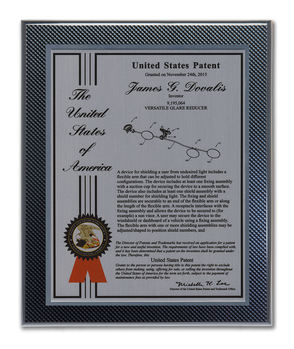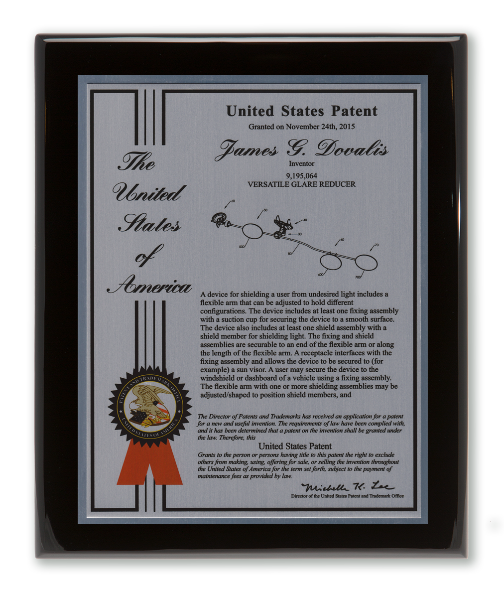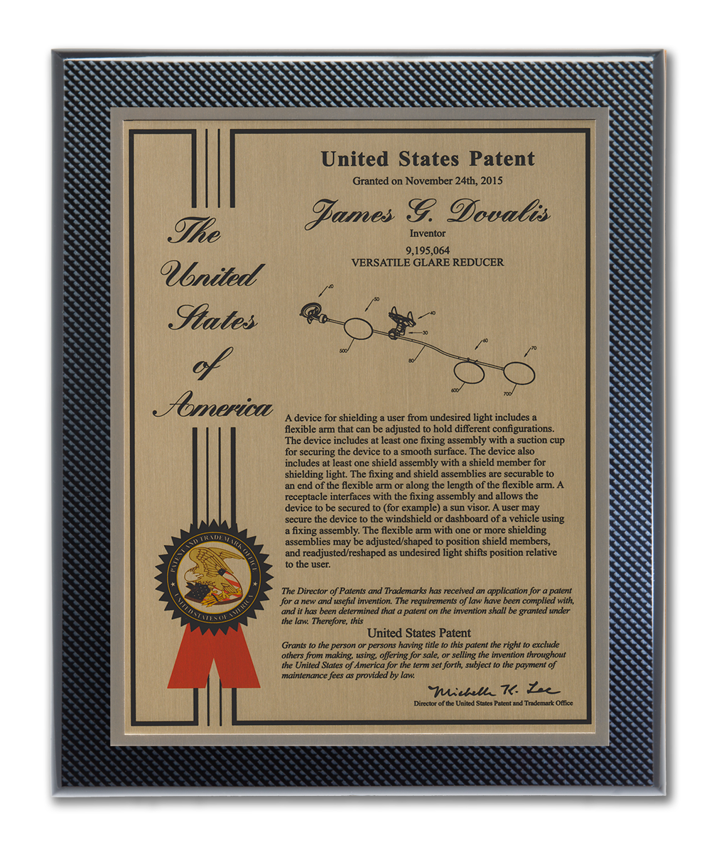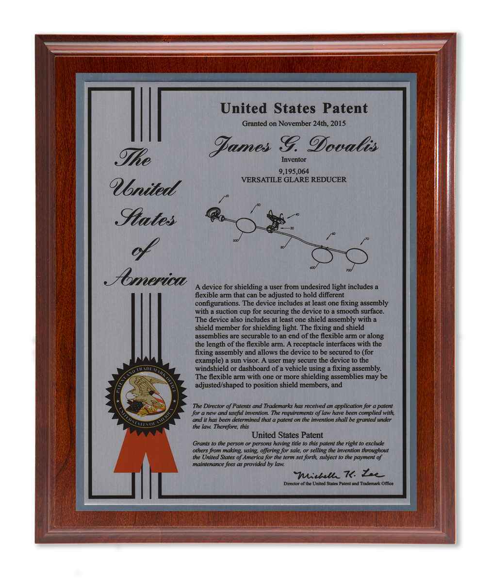 As one of our most patriotic layouts for patent recognition, the Liberty Series patent plaques are a stunning way to display your patent cover page. Your patent award information is attractively enhanced with a United States of America border and seal. The Liberty Series patent award is finished with a timeless and sleek edge style. You select from a variety of sizes as well as solid woods and plating selections to match your home, office, or corporate furnishings. Adding color is a perfect complement to the magnificence of the Liberty design patent plaque.