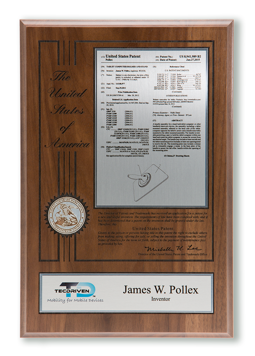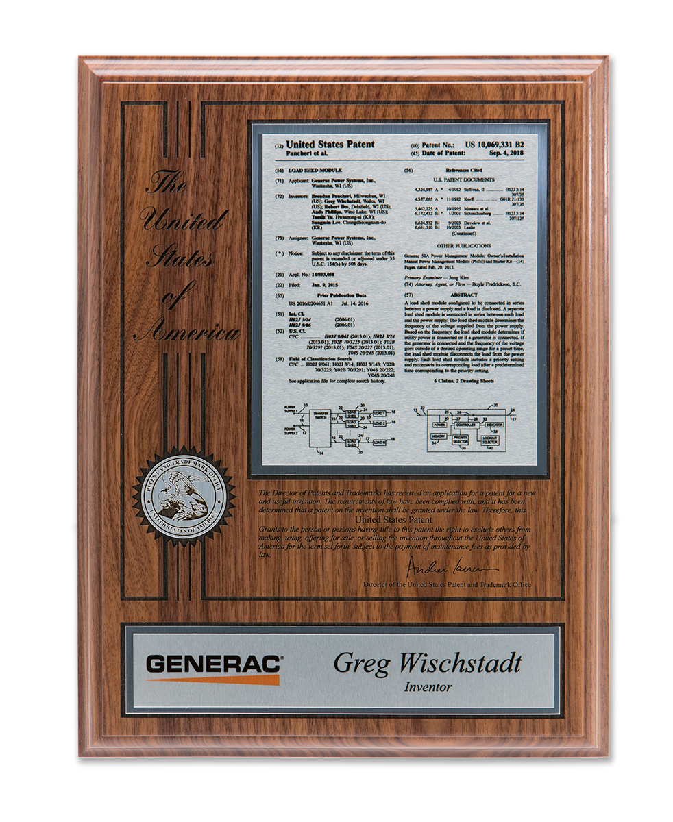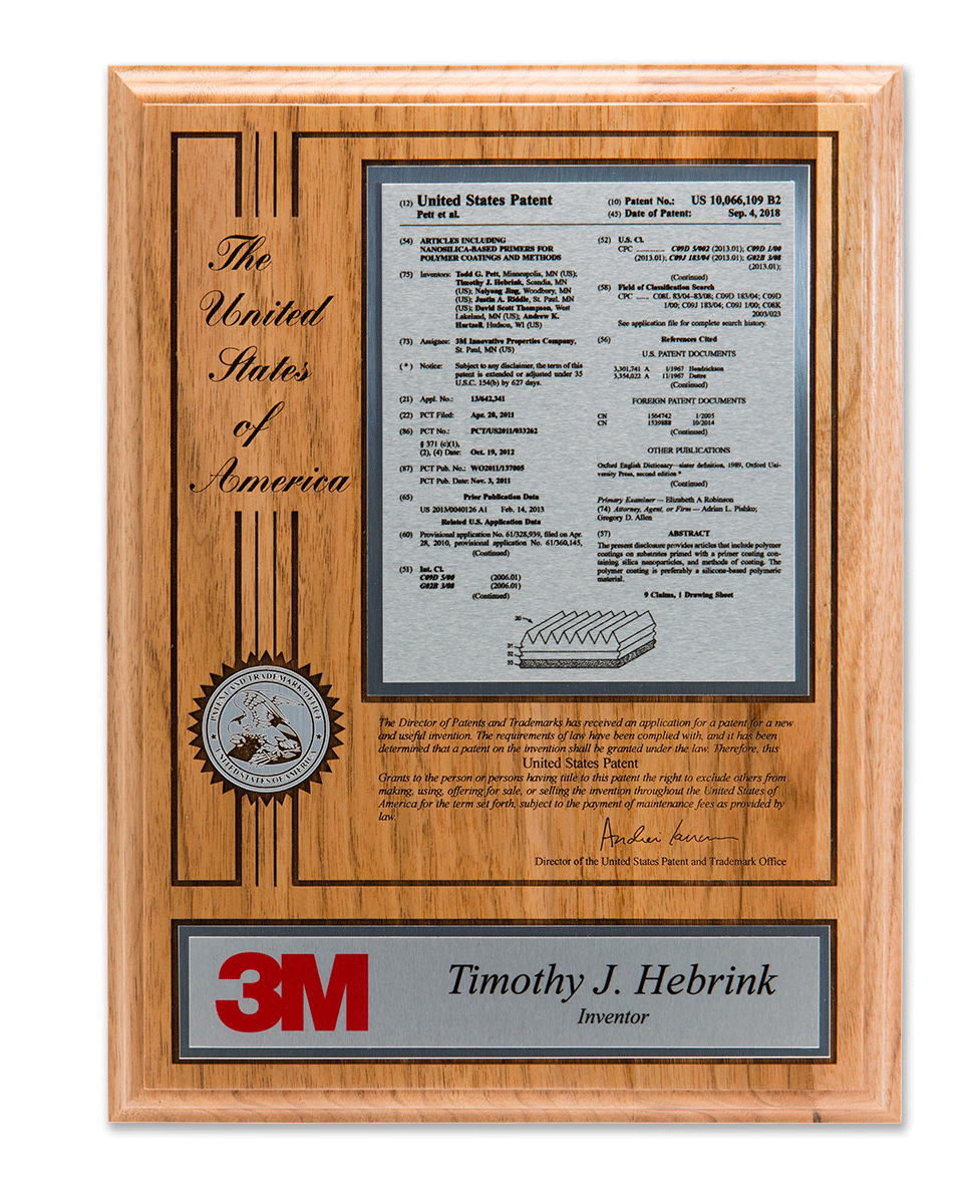 The Patriot Series Patent Plaque blends some of the patriotic elements of the Liberty Series design, but this extended award style includes a name plate to draw great attention to the inventor presented on a soft brushed plate with gloss back/trim plate. In this design, your patent information is beautifully enhanced with an engraved United States of America border and seal. Select from multiple solid wood choices, a wide range of sizes and several plating options. You also choose your edge style. Incorporating color adds character to this patent plaque that will fit well in any home, office or corporate environment. We especially like the Patriot Series for corporate office and lobby settings where there is a recognition display wall for patent awards from multiple inventors. However, it is also an attractive way to recognize individual inventors where their patents are not centrally displayed.